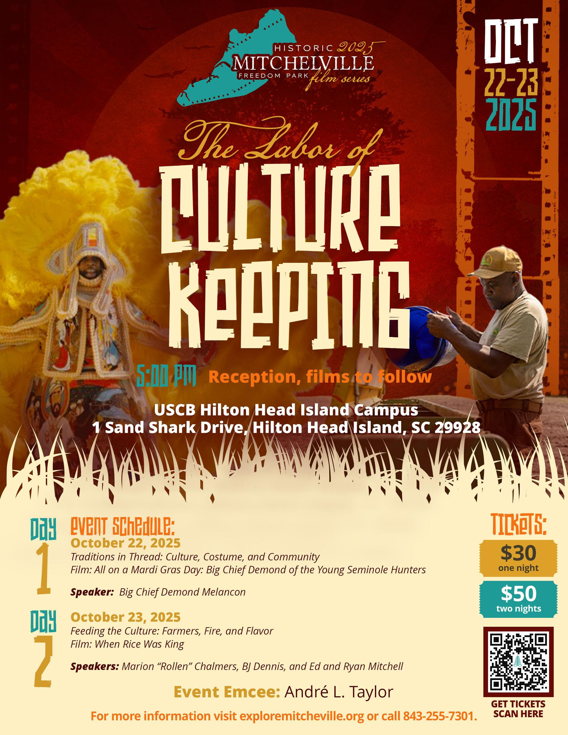 Join us for an unforgettable experience as Historic Mitchelville Freedom Park presents its 2025 Film Series: The Labor of Culture Keeping, October 22–23, 2025 at the USCB Hilton Head Island Campus.