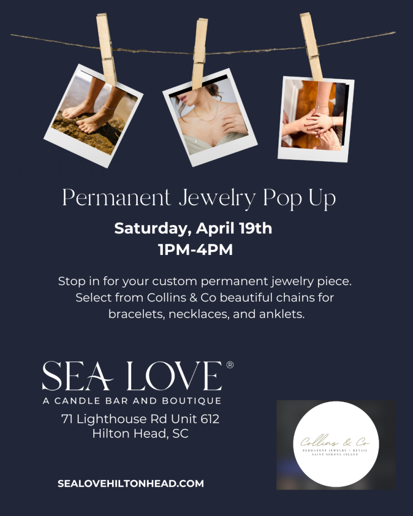 Sat April 19th, 1-4pm: Permanent Jewelry Show at Sea Love Candle Bar and Boutique. Stop in for your custom permanent jewelry piece. Select from Collins & Co beautiful chains for bracelets, necklaces, and anklets. For more information, click HERE.